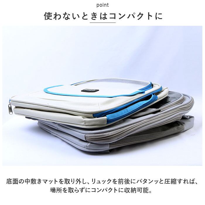 ・底面の中敷きマットを取り外し、リュックを前後にパタンッと圧縮すれば、場所を取らずにコンパクトに収納可能。