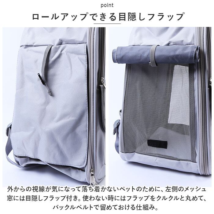 ・外からの視線が気になって落ち着かないペットのために、左側のメッシュ窓には目隠しフラップ付き。使わない時にはフラップをクルクルと丸めて、バックルベルトで留めておける仕組み。