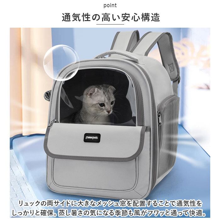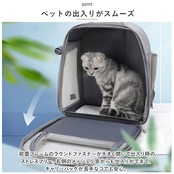 ・前面フレームのラウンドファスナーが大きく開いて出入り時のストレスフリー。右側のメッシュ小窓からも出入りができて、キャリーバッグが苦手なコでも安心。