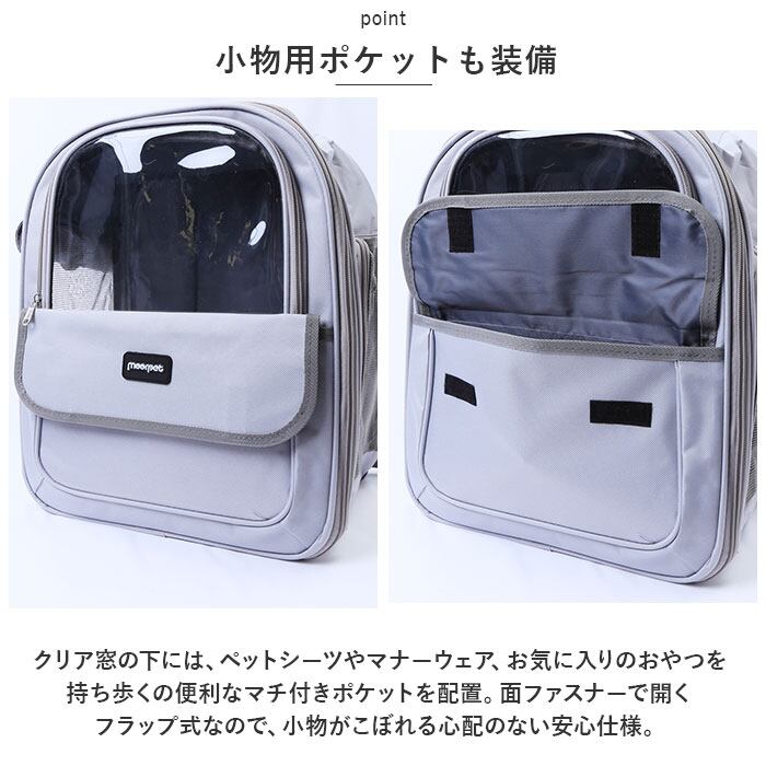 ・クリア窓の下には、ペットシーツやマナーウェア、お気に入りのおやつを持ち歩くの便利なマチ付きポケットを配置。面ファスナーで開くフラップ式なので、小物がこぼれる心配のない安心仕様。