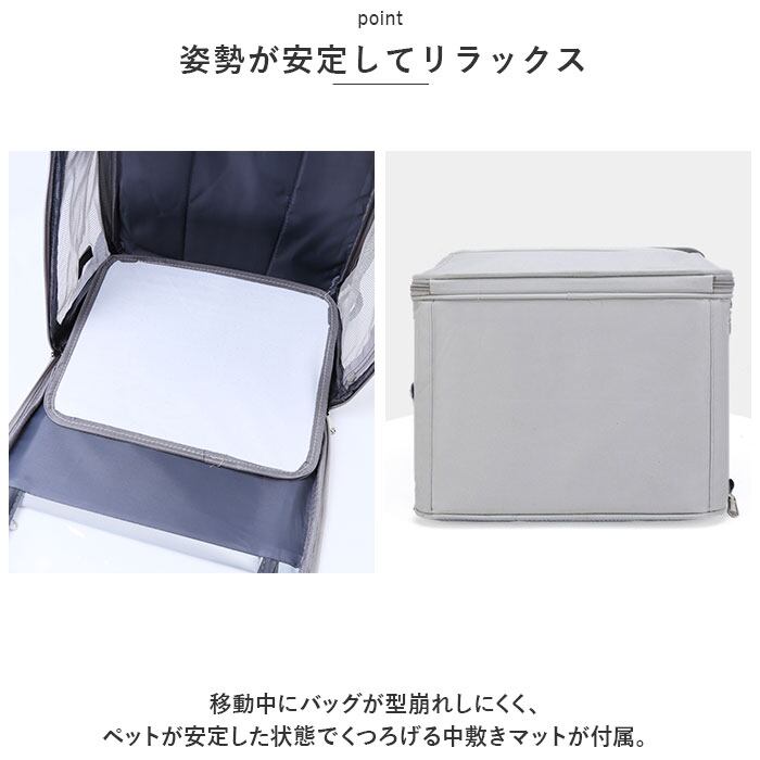 ・移動中にバッグが型崩れしにくく、ペットが安定した状態でくつろげる中敷きマットが付属。