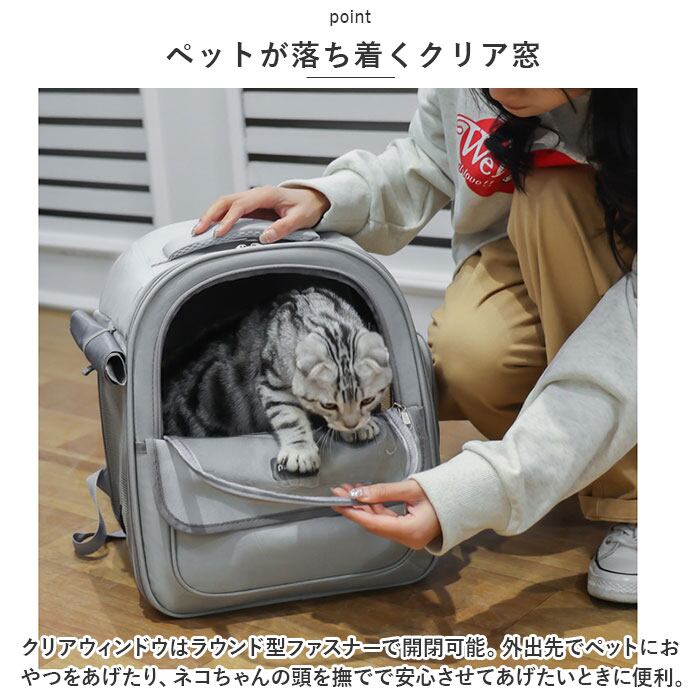 ・クリアウィンドウはラウンド型ファスナーで開閉可能。外出先でペットにおやつをあげたり、ネコちゃんの頭を撫でで安心させてあげたいときに便利。