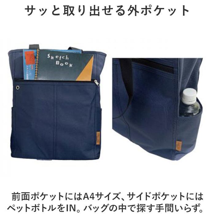 ・前面ポケットにはA4サイズ、サイドポケットにはペットボトルをIN。バッグの中で探す手間いらず。