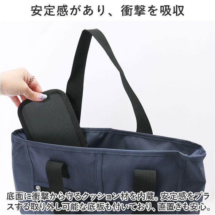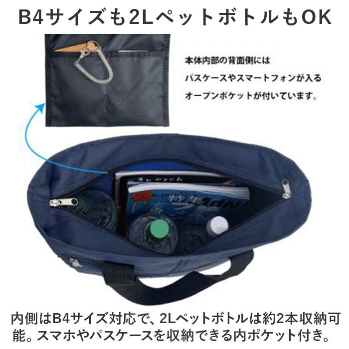 ・内側はB4サイズ対応で、2Lペットボトルは約2本収納可能。スマホやパスケースを収納できる内ポケット付き。