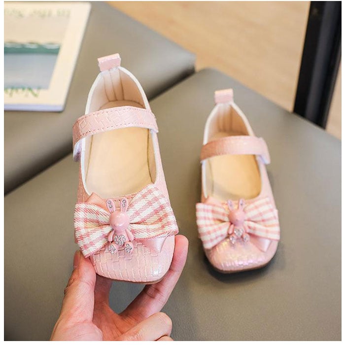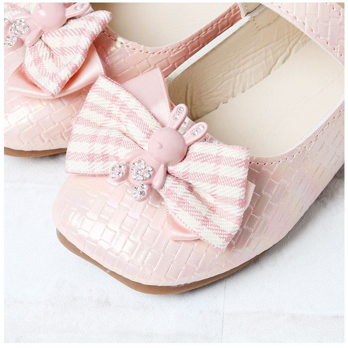・上品な光沢のある仕上がり。つま先部分には立体的なリボン&うさぎモチーフを配置。キラッと光るストーンなどをプラス。