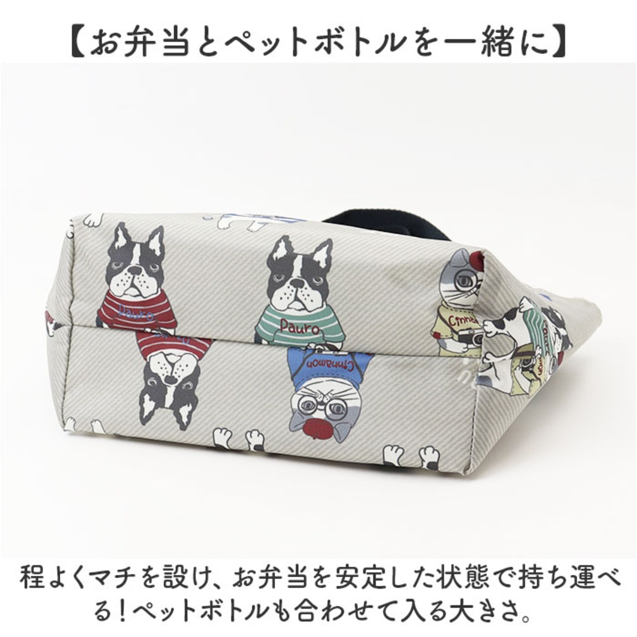 ・程よくマチを設け、お弁当を安定した状態で持ち運べる!ペットボトルも合わせて入る大きさ。