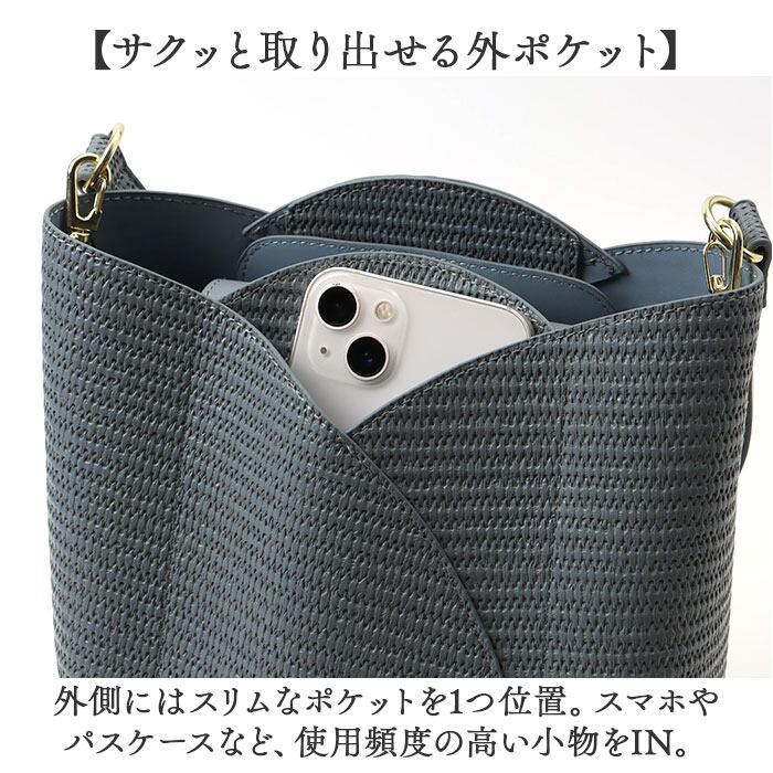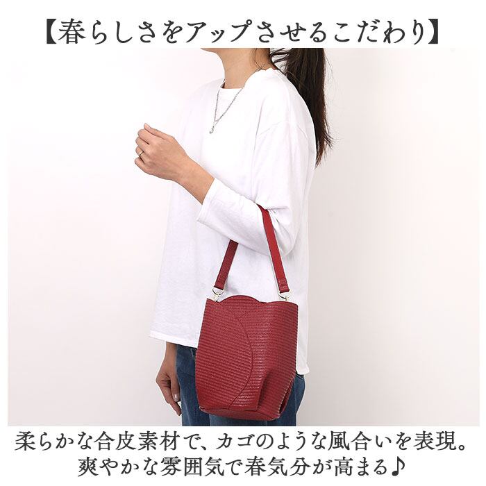 ・柔らかな合皮素材で、カゴのような風合いを表現。爽やかな雰囲気で春気分が高まる♪