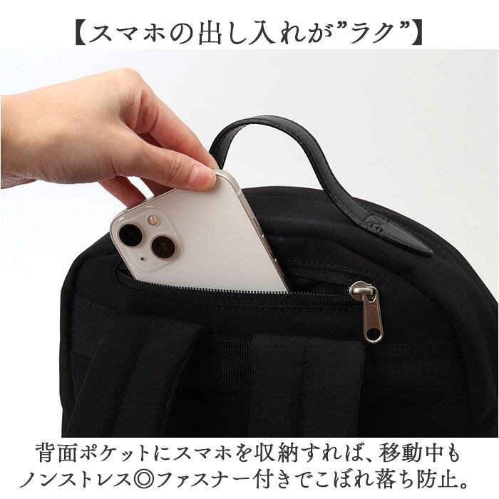 ・背面ポケットにスマホを収納すれば、移動中もノンストレス◎ファスナー付きでこぼれ落ち防止。