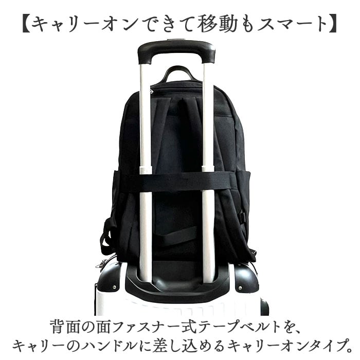 ・背面の面ファスナー式テープベルトを、キャリーのハンドルに差し込めるキャリーオンタイプ。