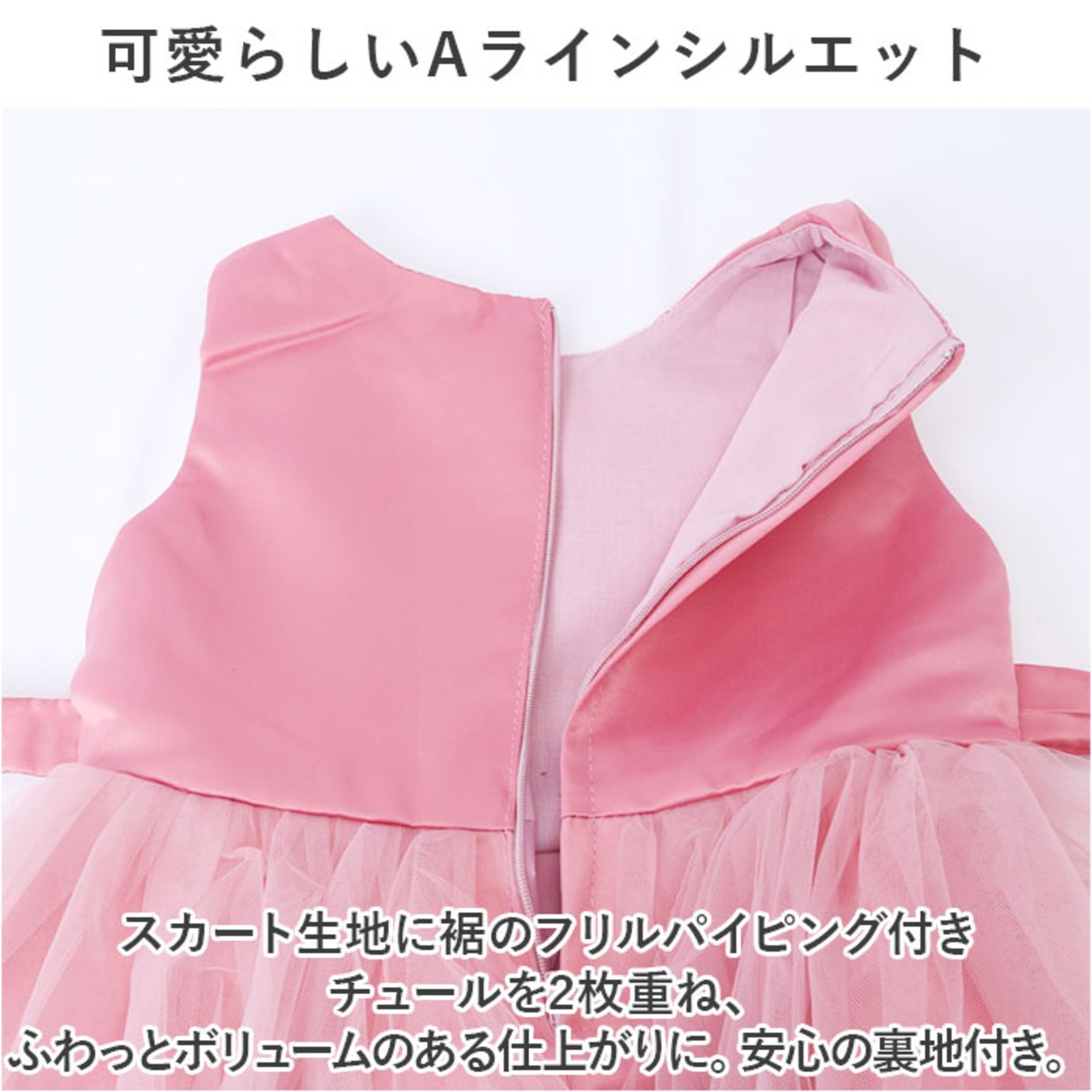 ・スカート生地に裾のフリルパイピング付きチュールを2枚重ね、ふわっとボリュームのある仕上がりに。安心の裏地付き。