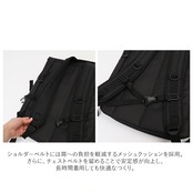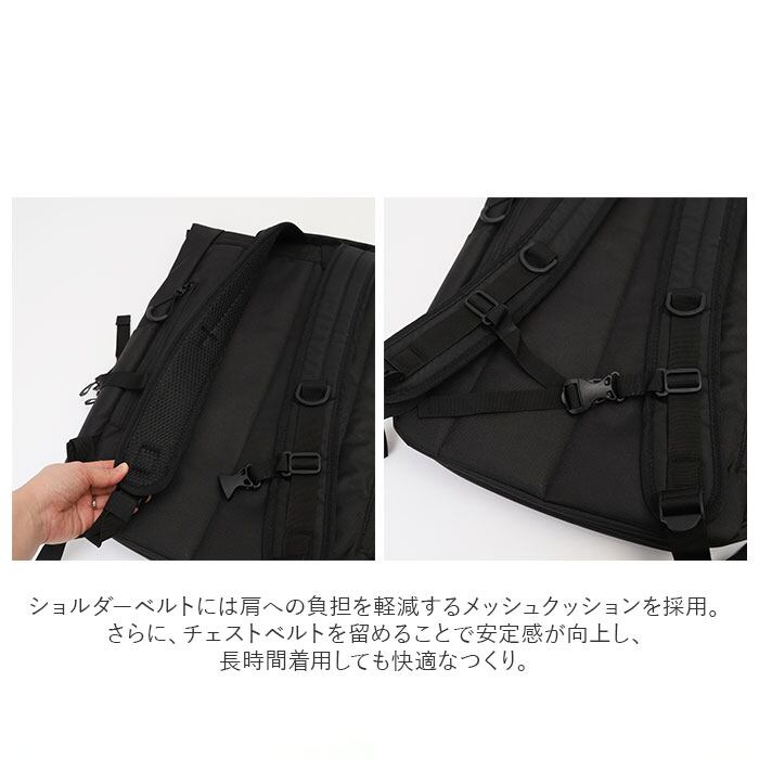 ・ショルダーベルトには肩への負担を軽減するメッシュクッションを採用。さらに、チェストベルトを留めることで安定感が向上し、長時間着用しても快適なつくり。