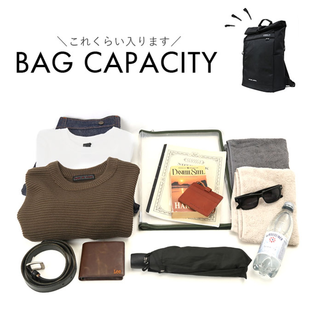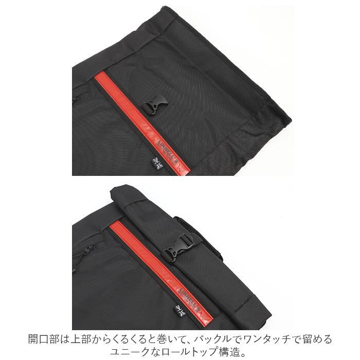 ・開口部は上部からくるくると巻いて、バックルでワンタッチで留めるユニークなロールトップ構造。
