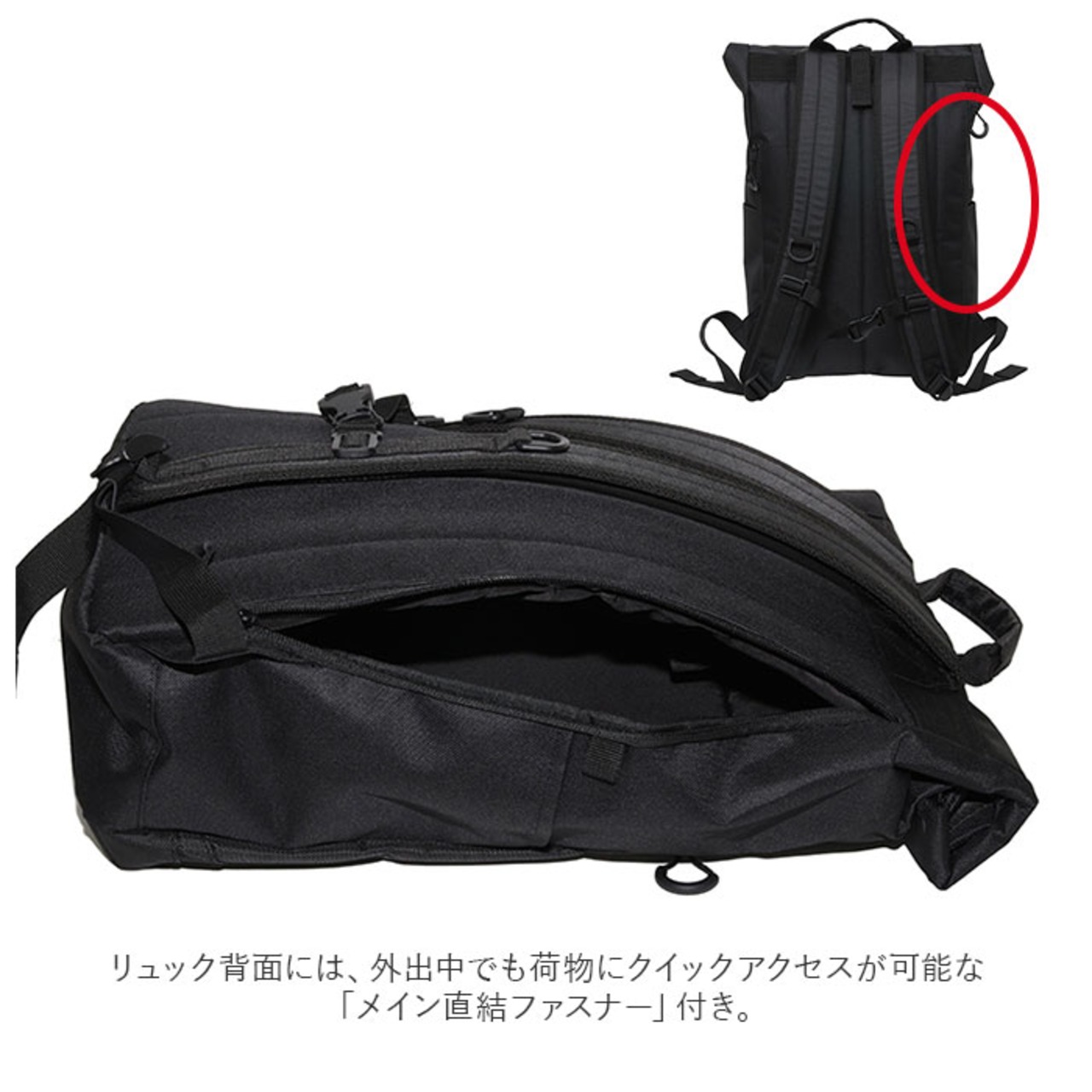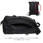 ・リュック背面には、外出中でも荷物にクイックアクセスが可能な「メイン直結ファスナー」、貴重品が安心して収納できる「シークレットポケット」付き。
