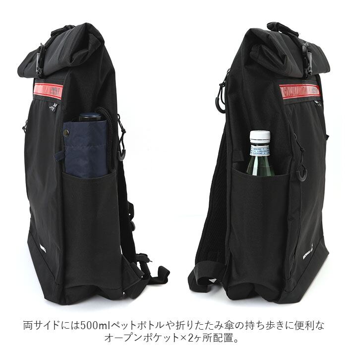 ・リュックフロントにスマホやパスケースなど、出番の多い小物がスムーズに取り出せる縦型ファスナーポケット×1ヶ所。両サイドには500mlペットボトルや折りたたみ傘の持ち歩きに便利なオープンポケット×2ヶ所配置。