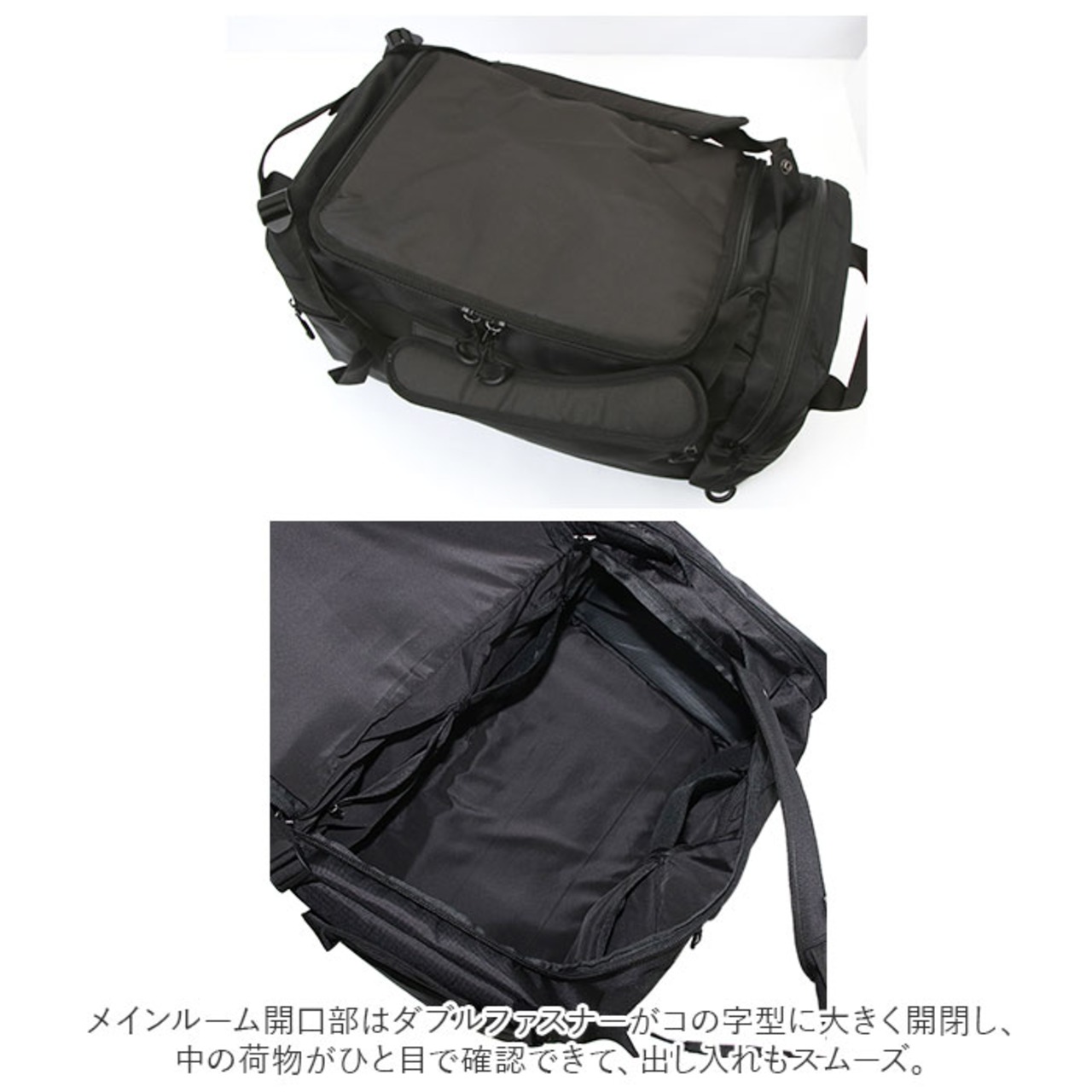 ・カチッとしたBOX型フォルムのメイン収納ルームは約45リットルの大容量設計。マチが広くB4ファイルが平置きに収まるサイズ感で、2泊3日程度の衣類や小物をたっぷりと収納可能。