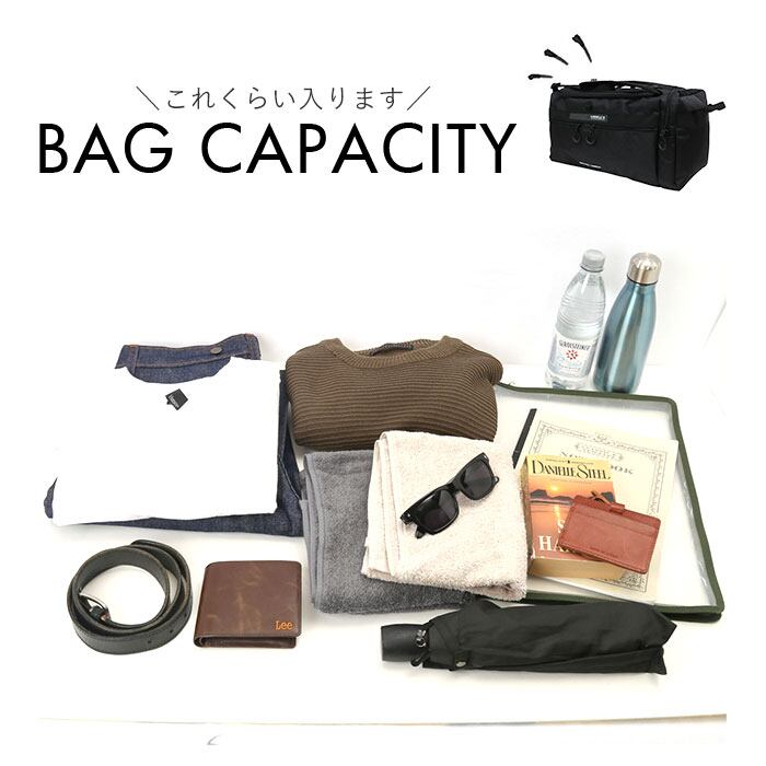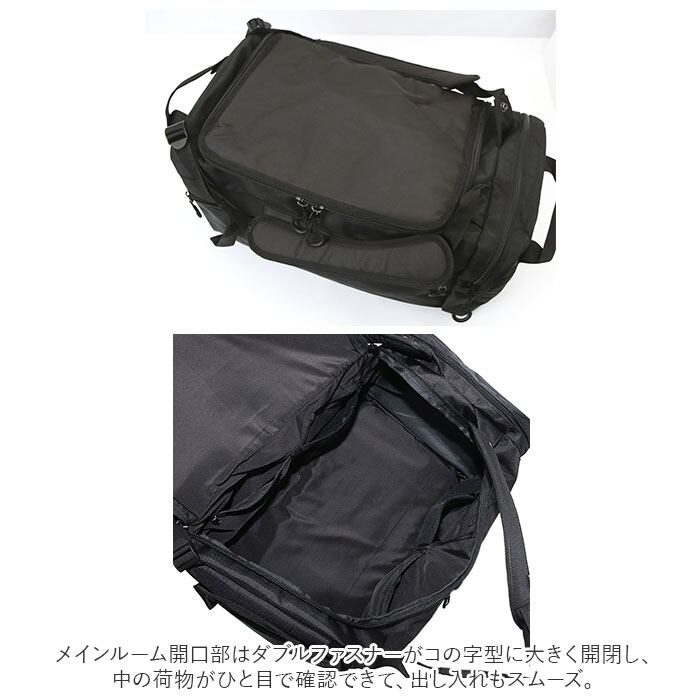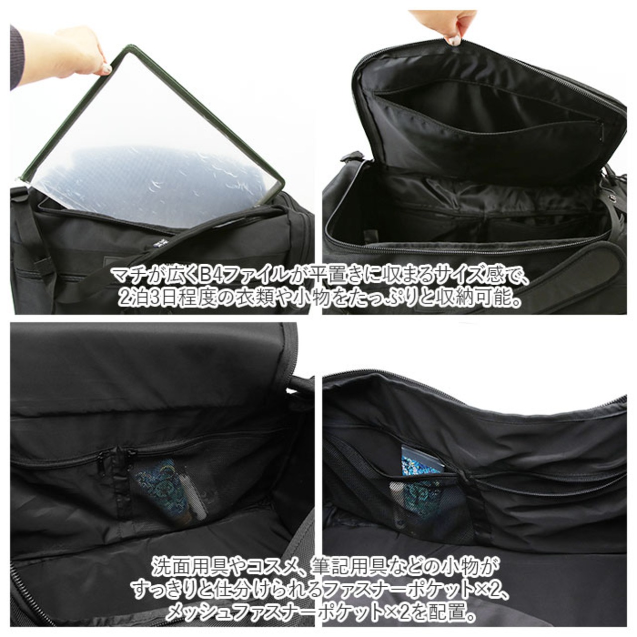 ・ボストンバッグ外側にも、前後にファスナーポケット×4、左サイドにマチ付きファスナーポケット×1を設け、収納ポケットが充実。スマホやパスケース、ウォーターボトルなど、取り出し頻度の高いアイテムの収納に便利。