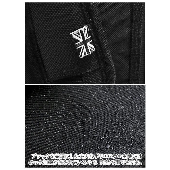 ・ブラックを基調にした丈夫なポリエステル生地にははっ水加工が施されているので、突然の雨でも安心。