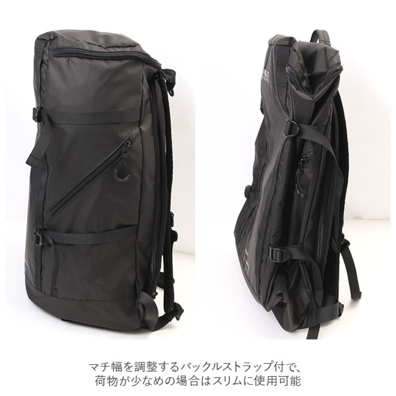・マチ幅を調整するバックルストラップ付で、荷物が少な目の場合はスリムに使用可能。