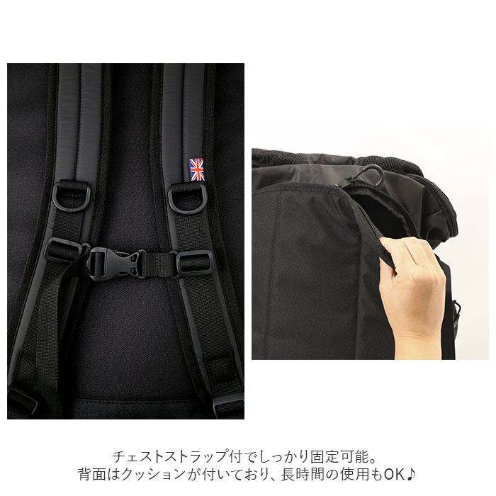・チェストストラップ付でしっかり固定可能。