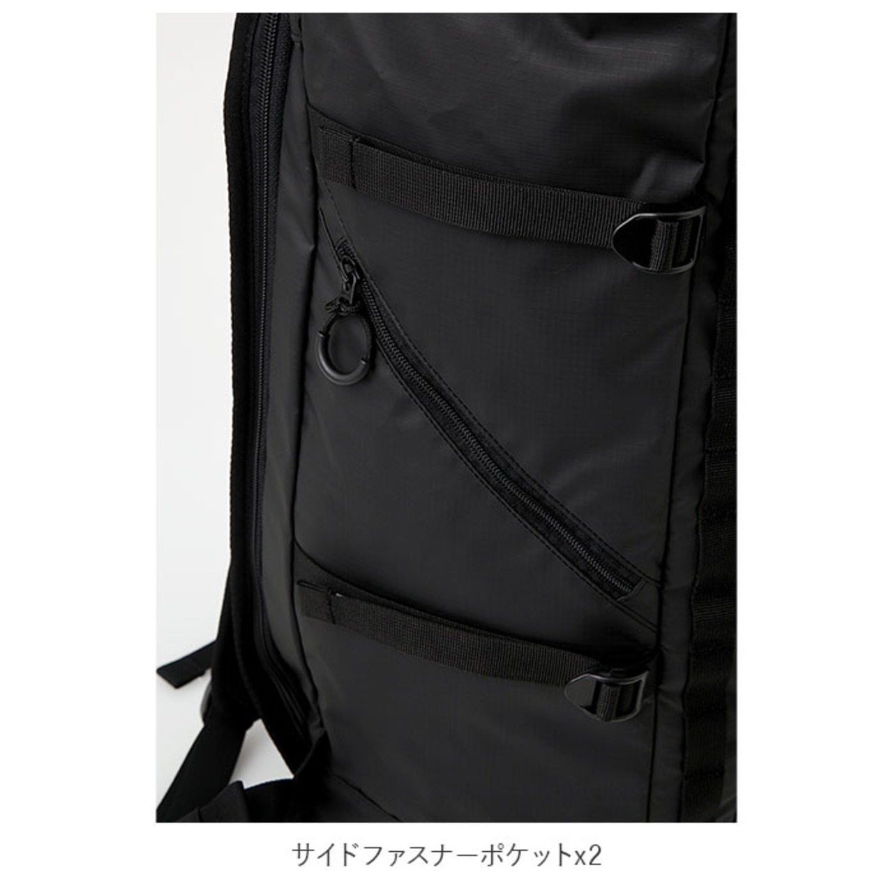 ・前面ファスナーポケットx1、サイドファスナーポケットx2、内側にポケットx2