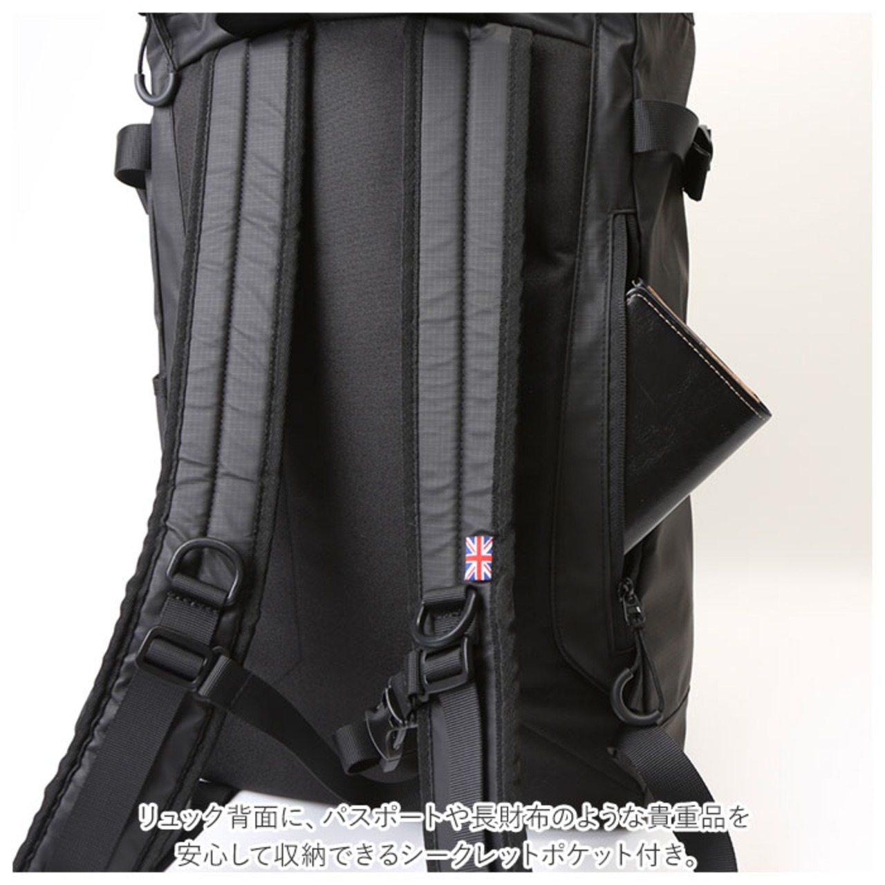 ・リュック背面に、パスポートや長財布のような貴重品を安心して収納できるシークレットポケット付き。