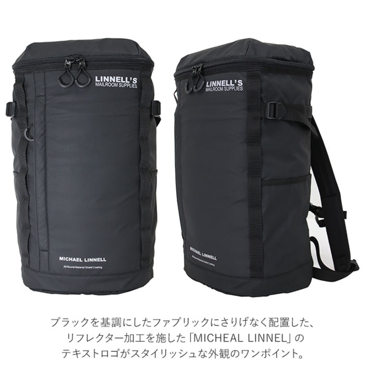 ・リフレクター加工を施した「MICHEAL LINNEL」のテキストロゴがスタイリッシュな外観のワンポイント。フロントのループはカラビナやお気に入りのチャームでデコレーションしてもOK!