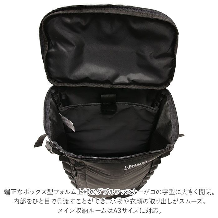 ・メインルームはA3サイズに対応。2泊3日程度の荷物がパッキング可能な約31リットルの大容量設計。