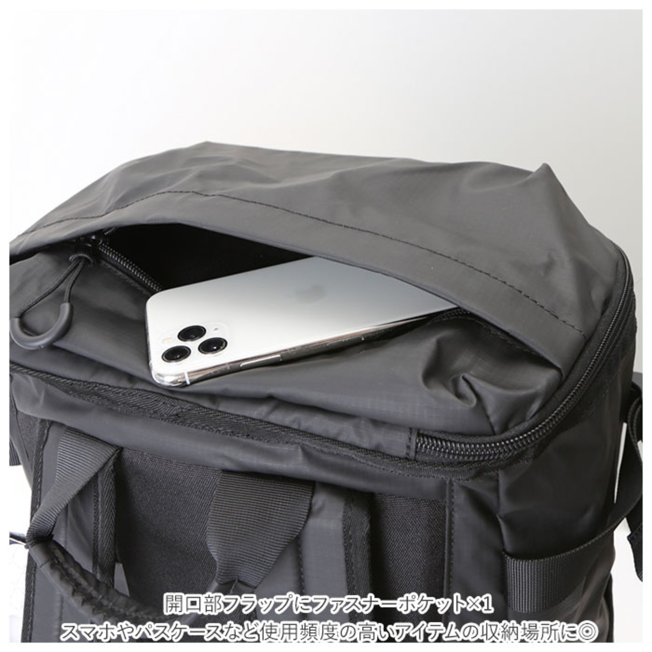 ・バックパック前面にB5サイズに対応した縦型ファスナーポケット、開口フラップにファスナーポケットを1つずつ設け、スマホやパスケースなど出番の多いアイテムの収納場所も使いやすくカスタマイズ!