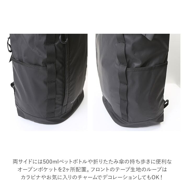 ・両サイドには500mlペットボトルや折りたたみ傘の持ち歩きに便利なオープンポケットを2ヶ所配置した他、荷物の量に応じてマチ幅を調整できるベルトループも付属!