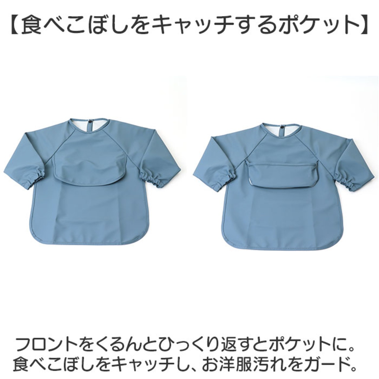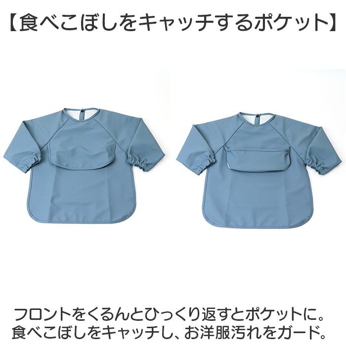 ・フロントをくるんとひっくり返すとポケットに。食べこぼしをキャッチし、お洋服汚れをガード。