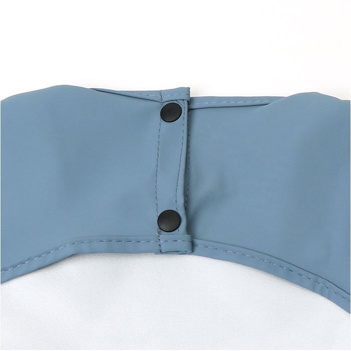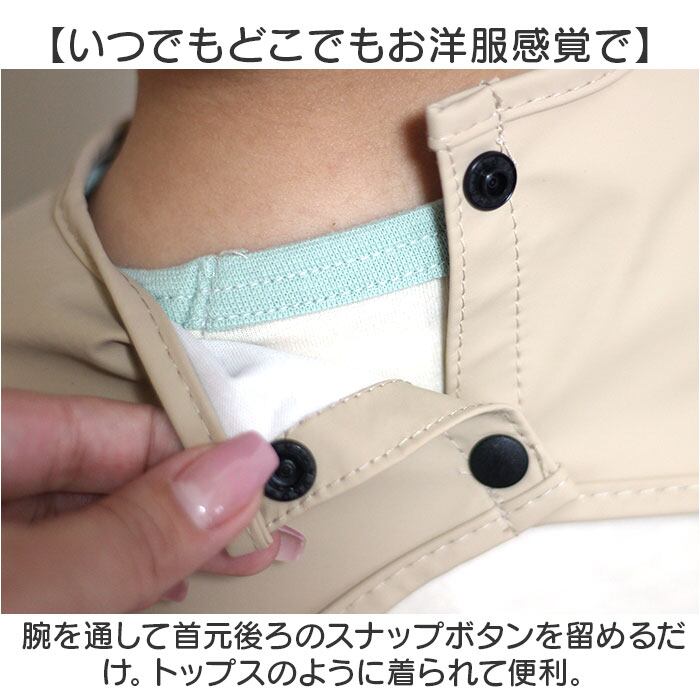 ・腕を通して首元後ろのスナップボタンを留めるだけ。トップスのように着られて便利。