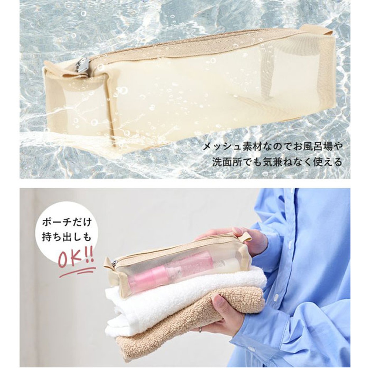 ・軽量で外側上部に持ち手付き。手に取りやすく、旅先の大浴場や温泉などへの移動もラクラク。