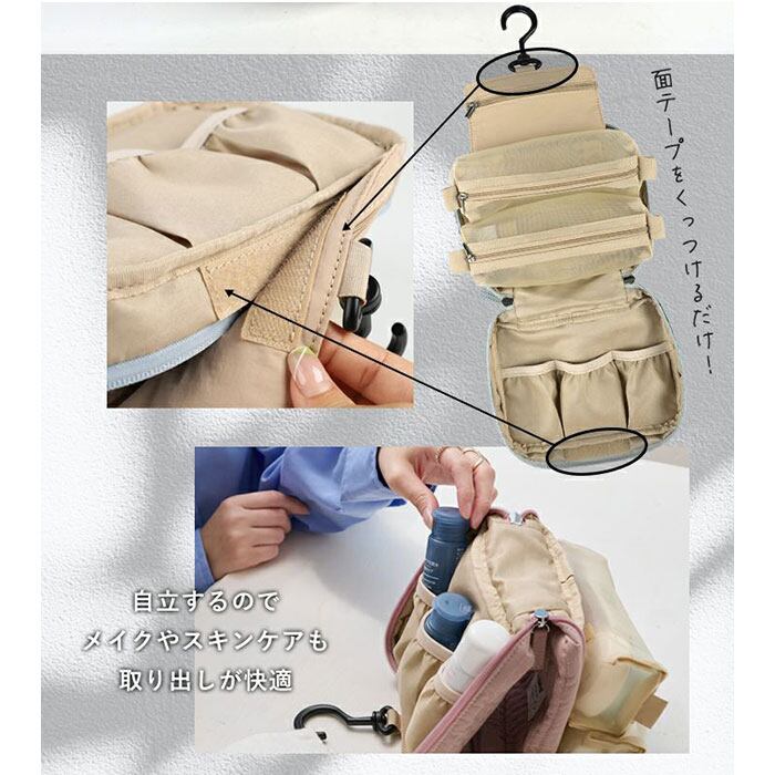 ・360度回転式S字フックを使ってホテルの洗面台などに吊り下げれば、便利な壁掛け収納に。