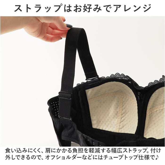 ・食い込みにくく、肩にかかる負担を軽減する幅広ストラップ。付け外しできるので、オフショルダーなどにはチューブトップ仕様で♪