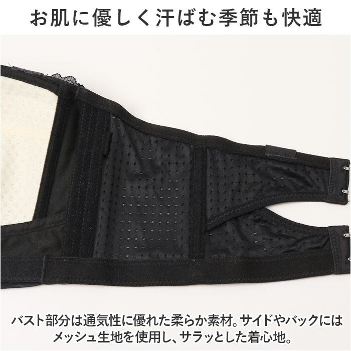 ・バスト部分は通気性に優れた柔らか素材。サイドやバックにはメッシュ生地を使用し、サラッとした着心地。