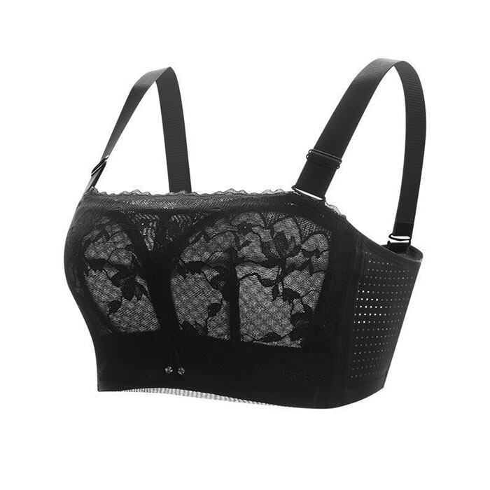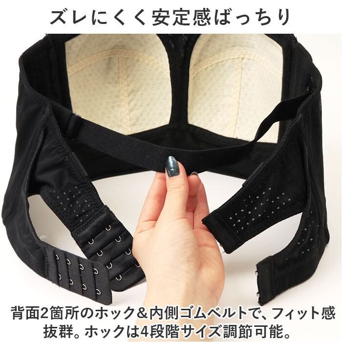 ・程よい硬さのサイドボーンが入った、脇高仕様。バストの揺れを抑えて横流れを防止し、背中もすっきりキレイ魅せ。
