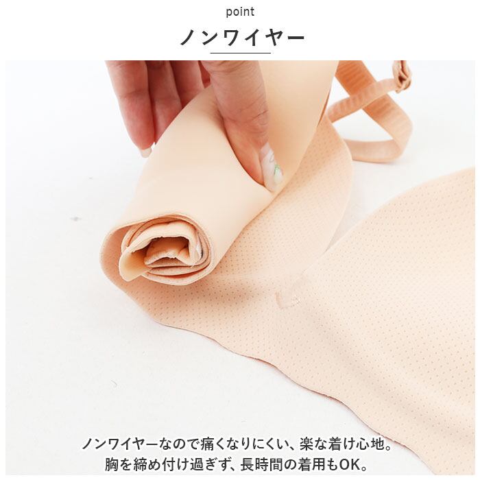 ・ノンワイヤーなので痛くなりにくい、楽な着け心地。胸を締め付け過ぎず、長時間の着用もOK。