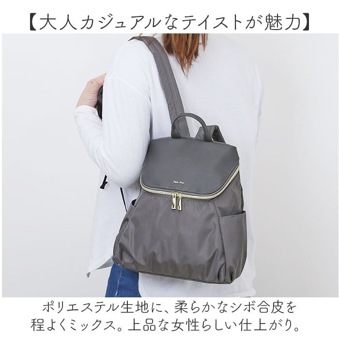 ・ポリエステル生地に、柔らかなシボ合皮を程よくミックス。上品な女性らしい仕上がり。
