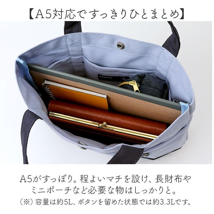 ・A5がすっぽり。程よいマチを設け、長財布やミニポーチなど必要な物はしっかりと。