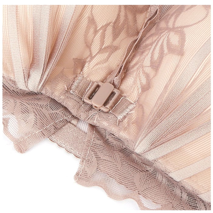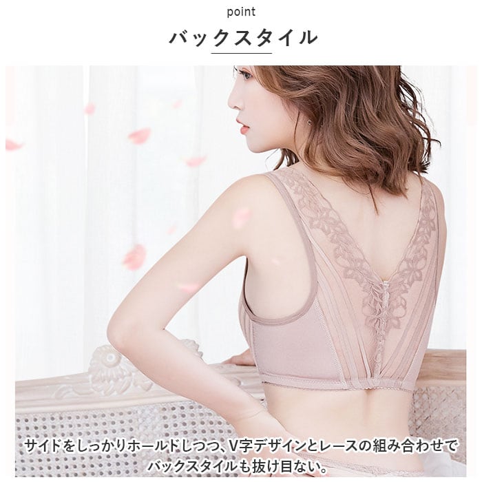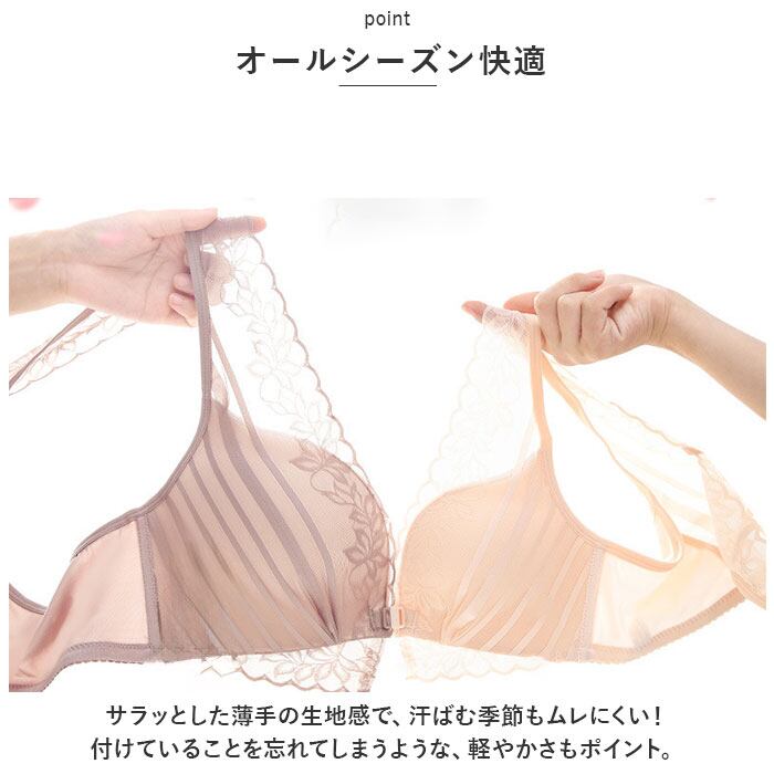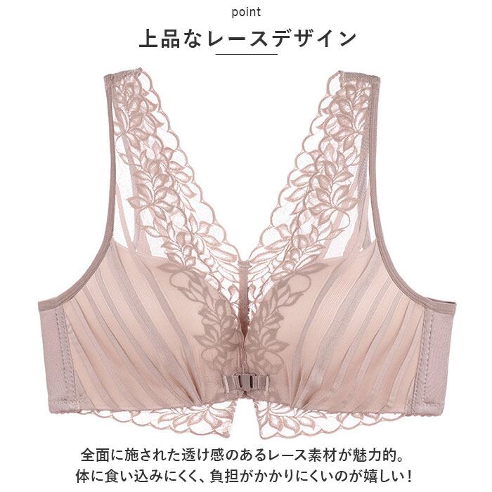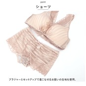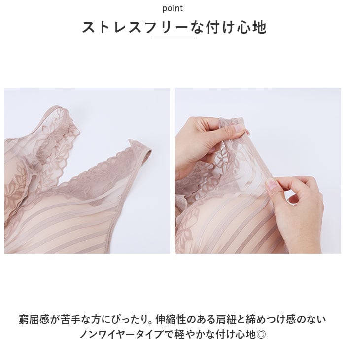 ・全面に施された透け感のあるレース素材が魅力的。体に食い込みにくく、負担がかかりにくいのが嬉しい!