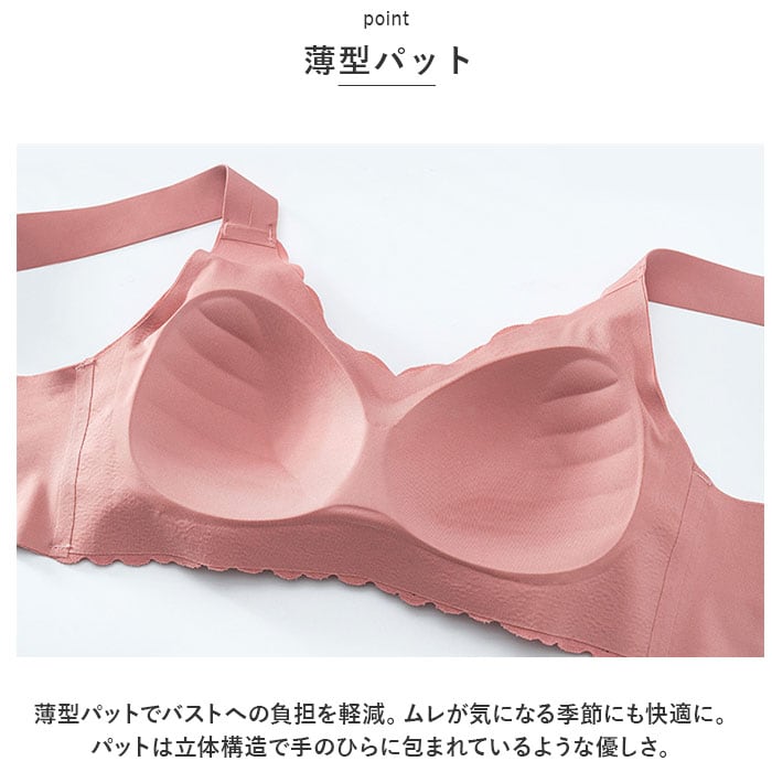 ・薄型パットでバストへの負担を軽減。ムレが気になる季節にも快適に。パットは立体構造で手のひらに包まれているような優しさ。