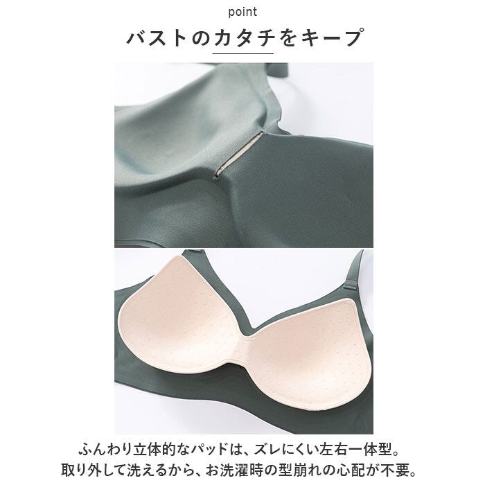 ・ふんわり立体的なパッドは、ズレにくい左右一体型。取り外して洗えるから、お洗濯時の型崩れの心配が不要。