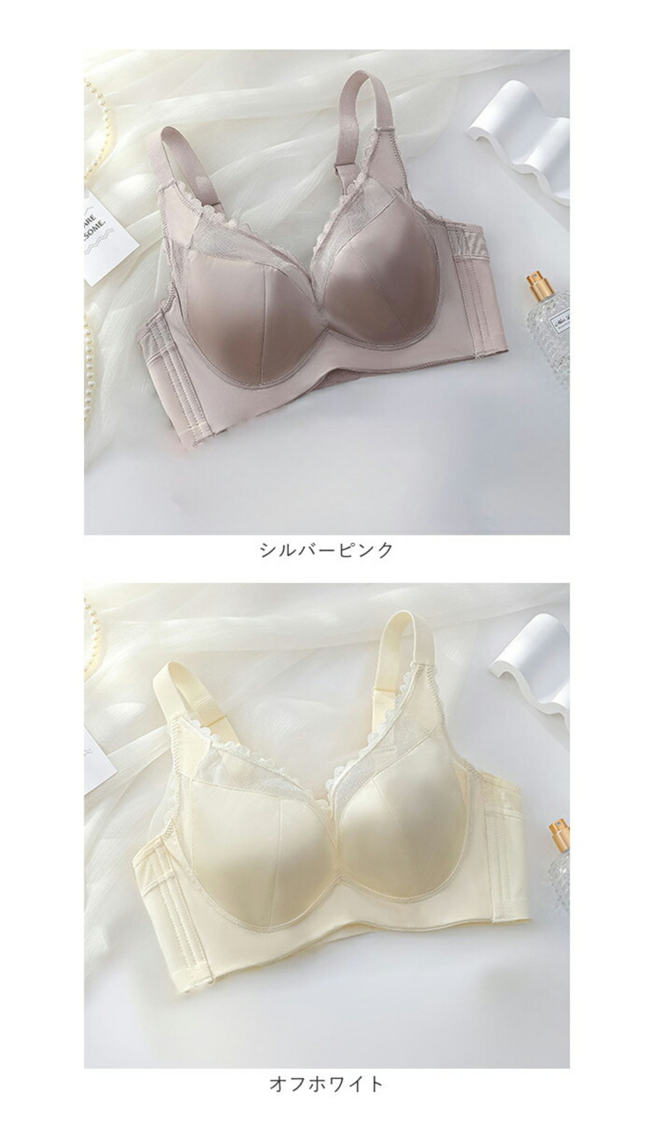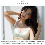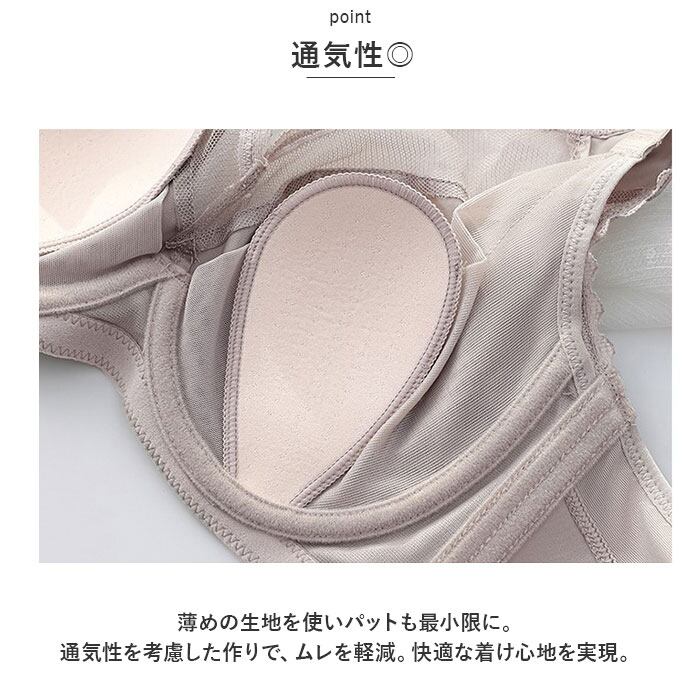 ・脇高設計で流れやすいバストをしっかりと支え、両サイドをすっきり見せる。ワイヤー入りでしっかりホールドするので、大胸さんにおすすめのブラ。
