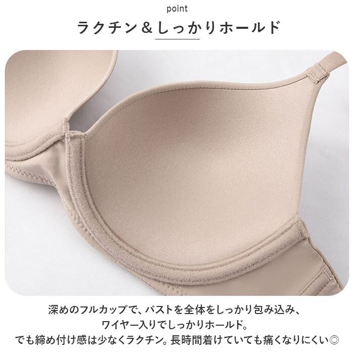 ・深めのフルカップで、バストを全体をしっかり包み込み、ワイヤー入りでしっかりホールド。でも締め付け感は少なくラクチン。長時間着けていても痛くなりにくい◎