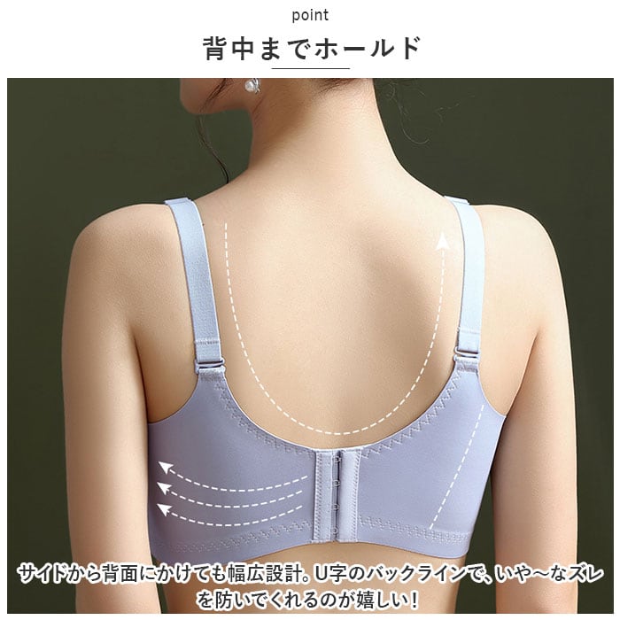 ・程よい硬さのサイドボーンが入った、脇高仕様。バストの揺れを抑えて横流れを防止し、背中もすっきりキレイ魅せ。