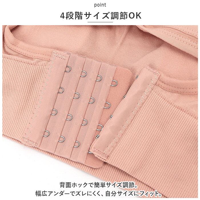 ・背面ホックで簡単サイズ調節。幅広アンダーでズレにくく、自分サイズにフィット。