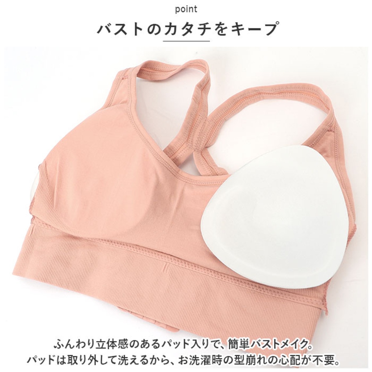 ・ふんわり立体感のあるパッド入りで、簡単バストメイク。パッドは取り外して洗えるから、お洗濯時の型崩れの心配が不要。