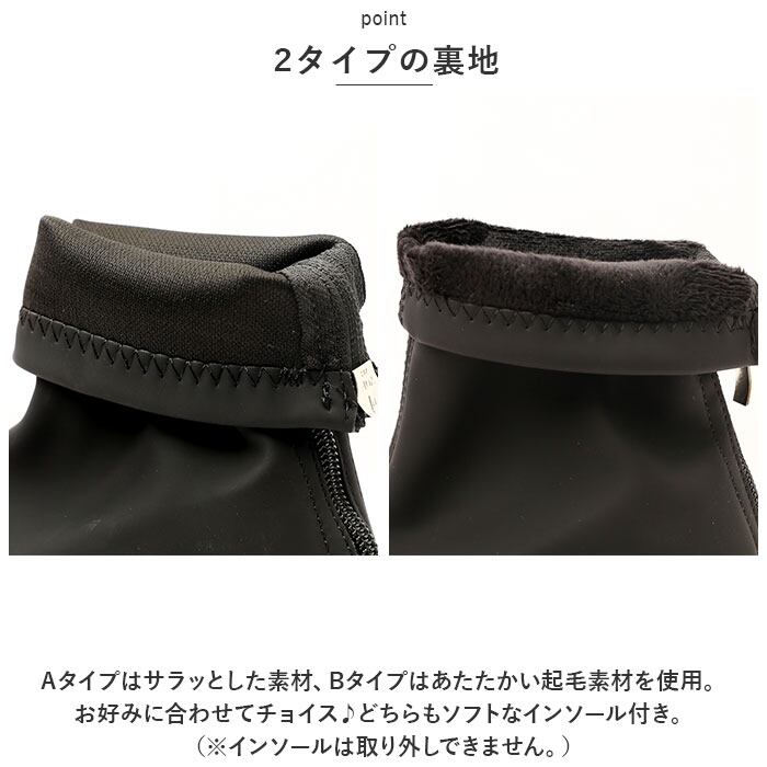 ・Aタイプはサラッとした素材、Bタイプはあたたかい起毛素材を使用。お好みに合わせてチョイス♪どちらもソフトなインソール付き。(※インソールは取り外しできません。)