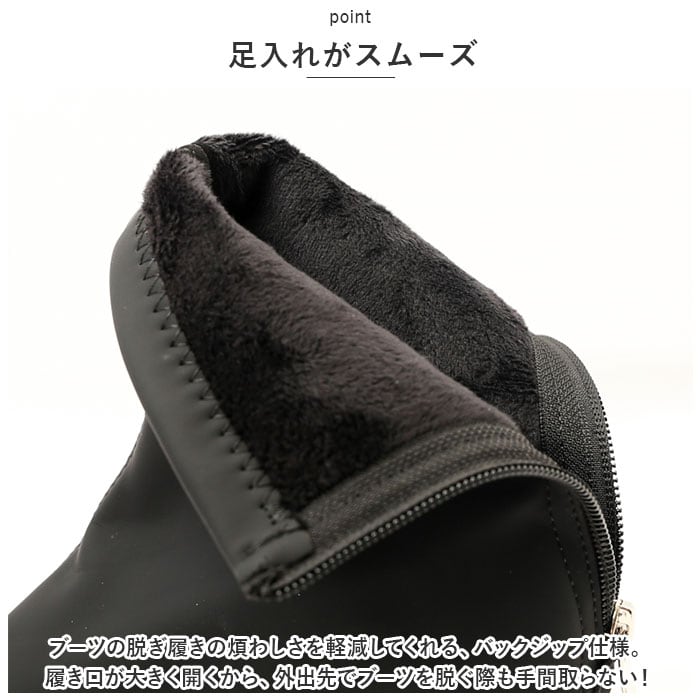 ・ブーツの脱ぎ履きの煩わしさを軽減してくれる、バックジップ仕様。履き口が大きく開くから、外出先でブーツを脱ぐ際も手間取らない!