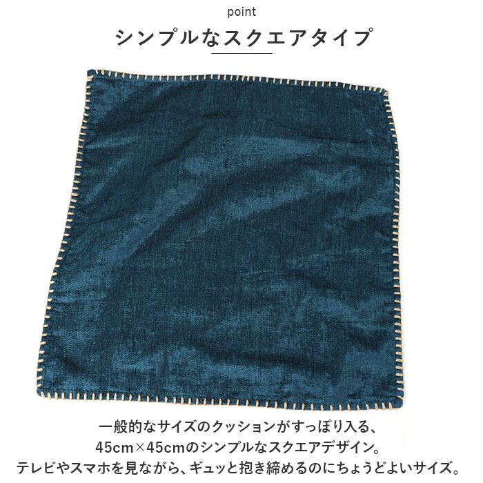 ・一般的なサイズのクッションがすっぽり入る、45cm×45cmのシンプルなスクエアデザイン。テレビやスマホを見ながら、ギュッと抱き締めるのにちょうどよいサイズ。